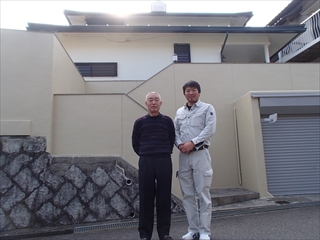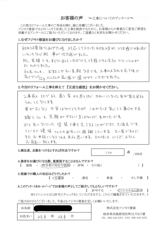 外壁の塗り替え時期が来て数あるリフォーム店から業者を選ぶことは大変不安なことでした。 そんな時ネットで相談したところフジモト建装様に早速来て頂きました。とても礼儀正しく人当りの良いのが第一印象でした。 見積もりも他2社を取っていたのですが、フジモト建装様にお願いし見積もっていただいたところ、 一目瞭然でしっかりしたものでした。説明もわかりやすく丁寧にされていたこと等、いろんな観点からここなら間違いなく大丈夫と思い決めさせて頂きました。 塗装の色も大変悩みました。何回もカラーシュミレーションして頂