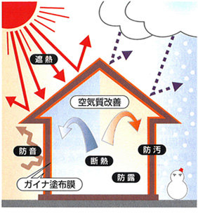 ガイナを住宅の屋根・外装・内装に塗ると、光線や熱、音や汚れなどを跳ね返し、断熱・遮熱などの効果を発揮します。