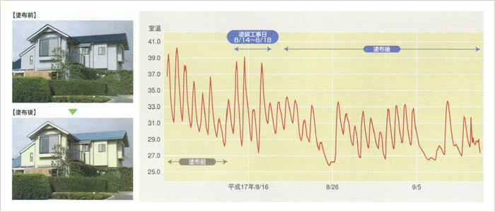 塗布前は40℃前後であった室温が塗布後は外気温とほぼ同温度となり、施主の生活実感としては、温度計の数字以上に快適になった、とのことでした。