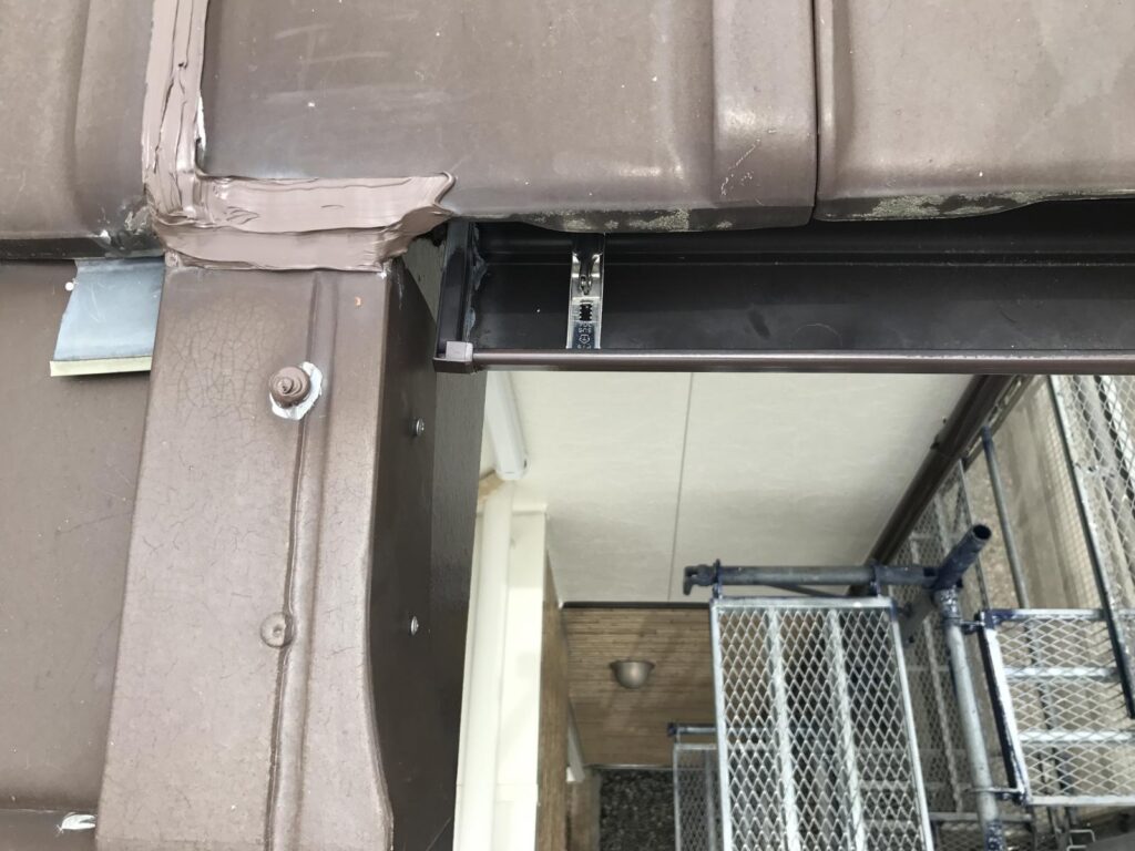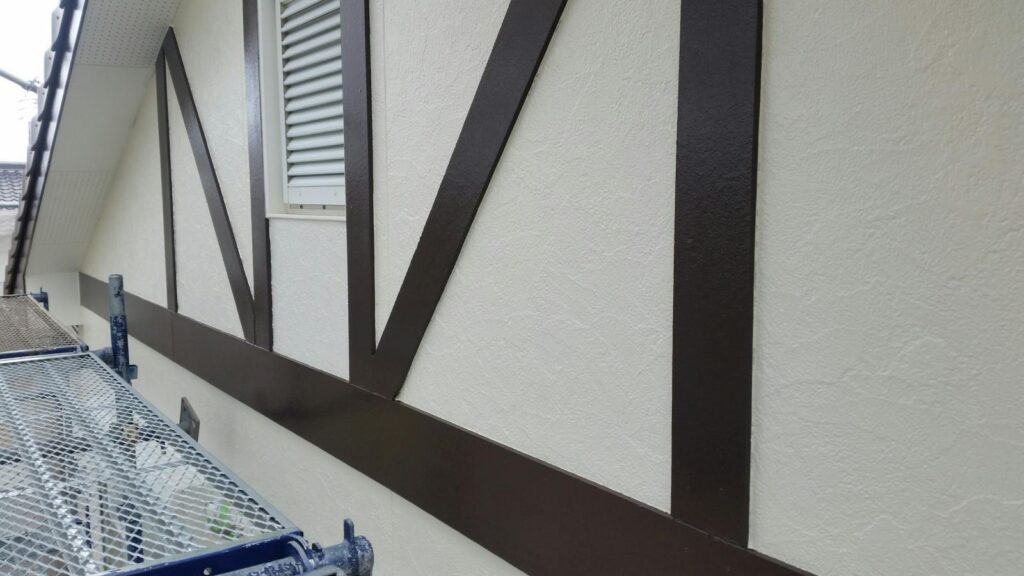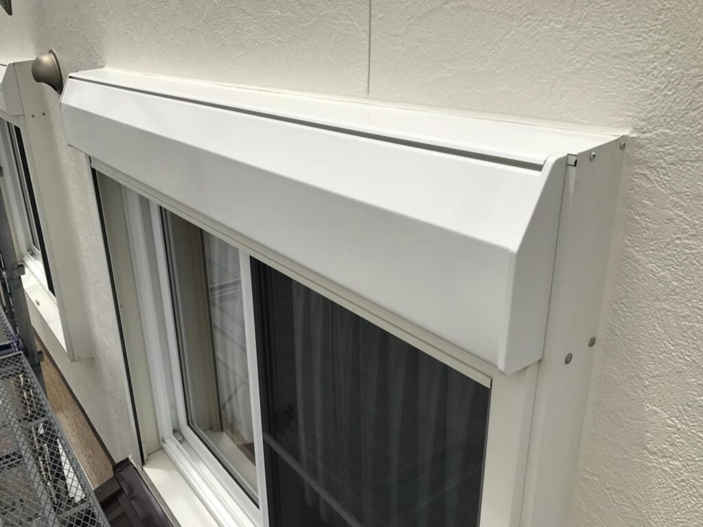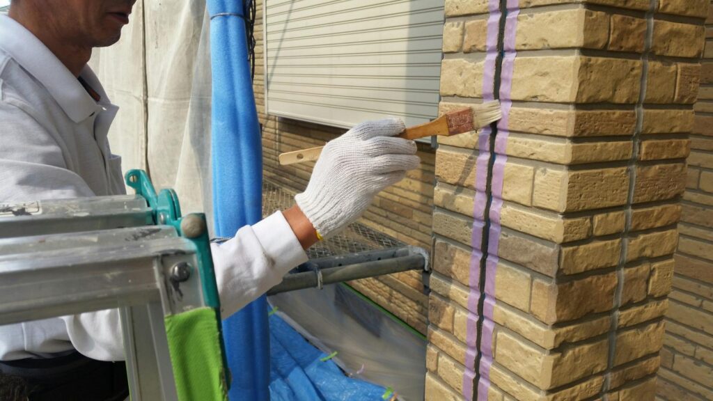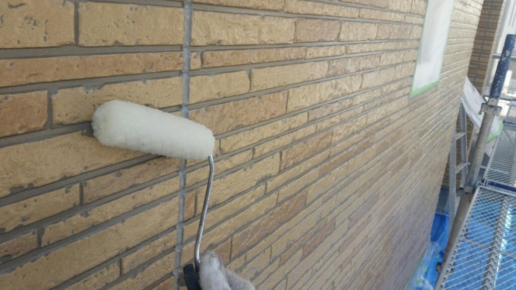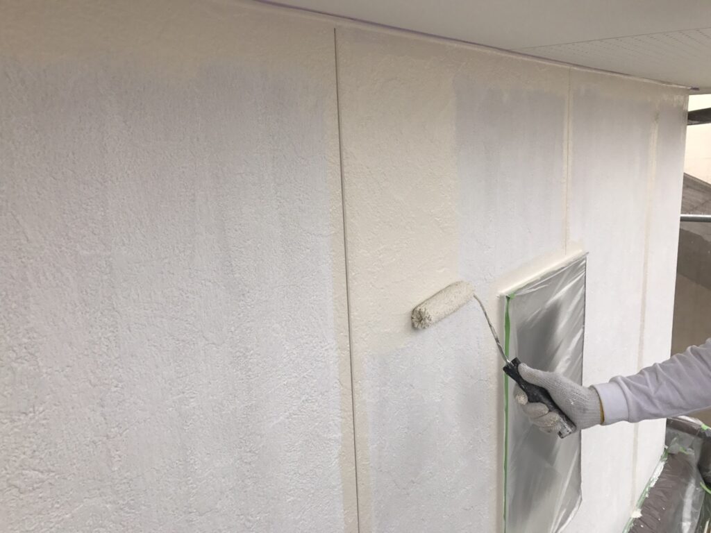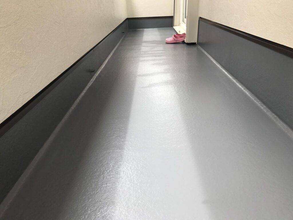 外壁塗装、クリヤー塗装、シーリング打ち替え、付帯部の塗装等、ベランダFRP防水のトップコート