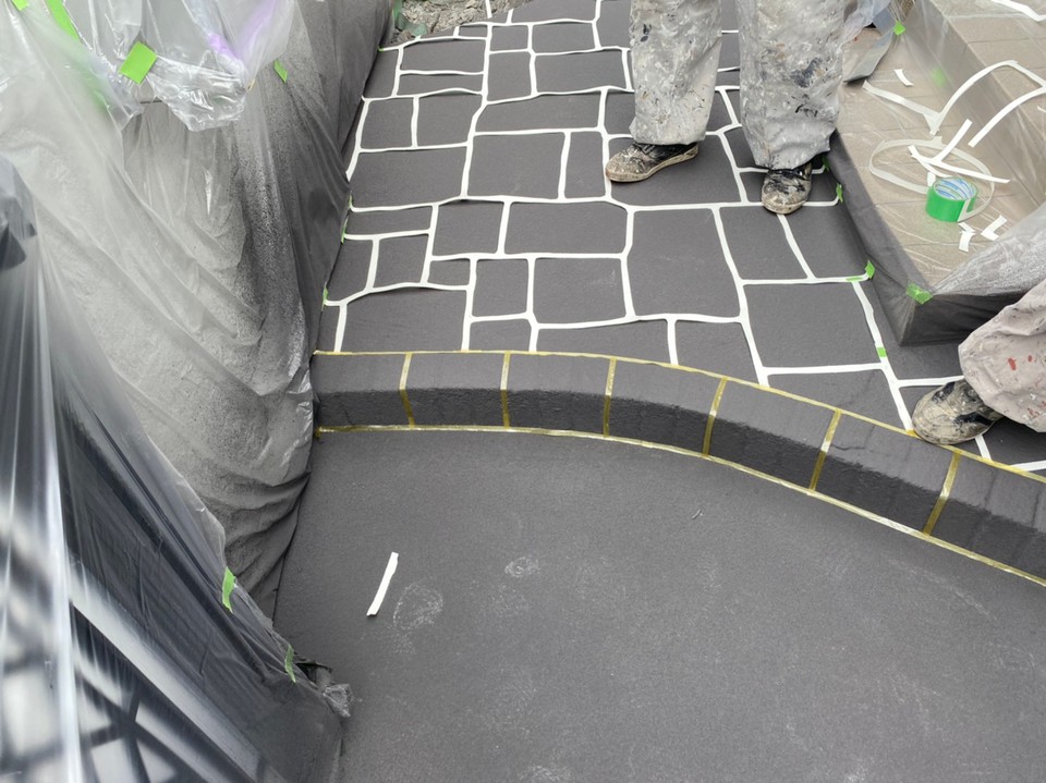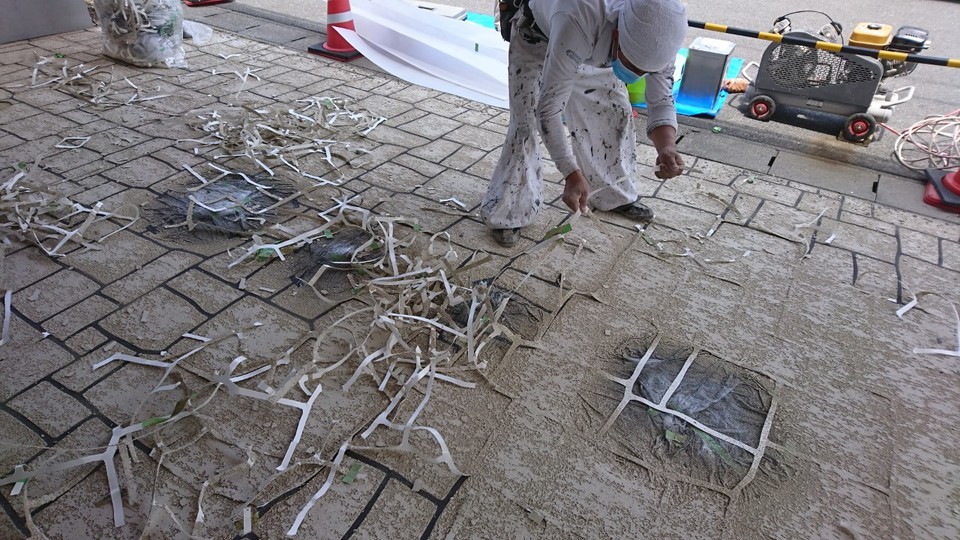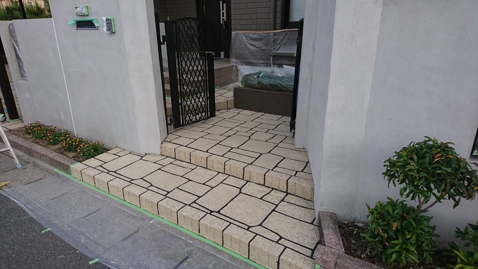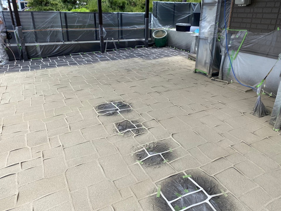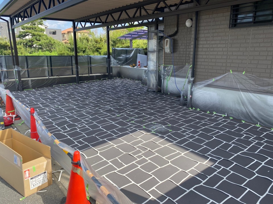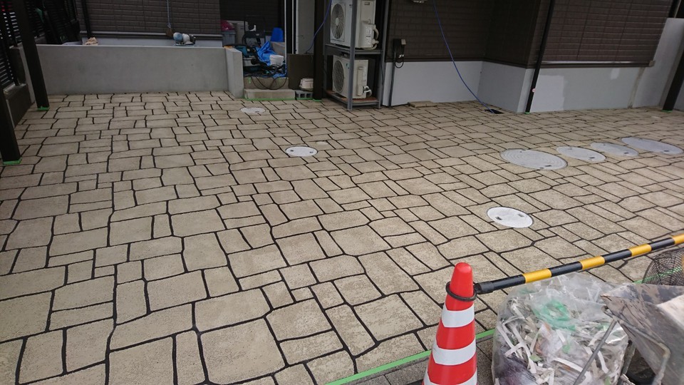既設駐車場のリフォームを施工 クラックの補修等下地を処理した後、ステンシル貼り、吹き付け等、、、数工程 土間がおしゃれに生まれ変わります。 3日間は養生期間なので車は入れません。 カットストーン(模様) イエローストーン(色)