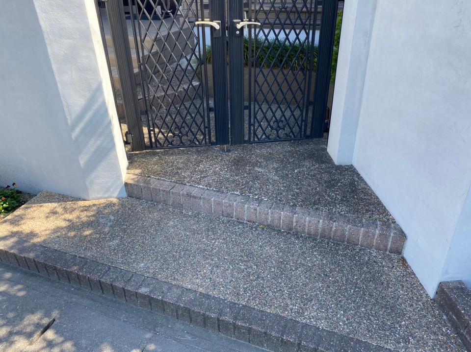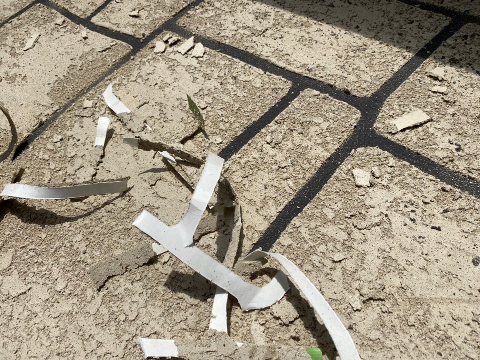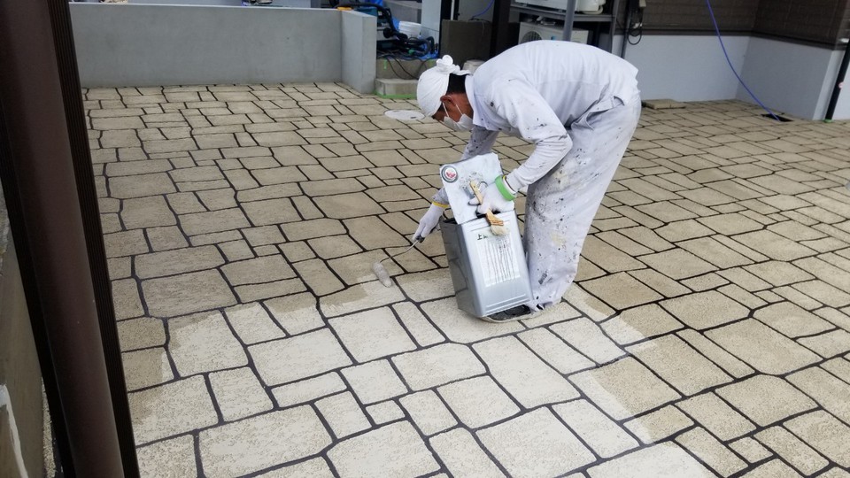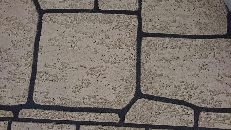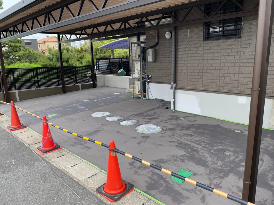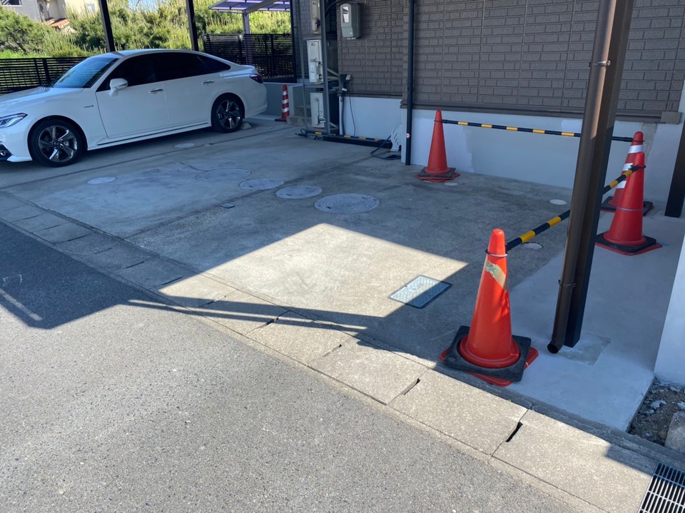 既設駐車場のリフォームを施工 クラックの補修等下地を処理した後、ステンシル貼り、吹き付け等、、、数工程 土間がおしゃれに生まれ変わります。 3日間は養生期間なので車は入れません。 カットストーン(模様) イエローストーン(色)