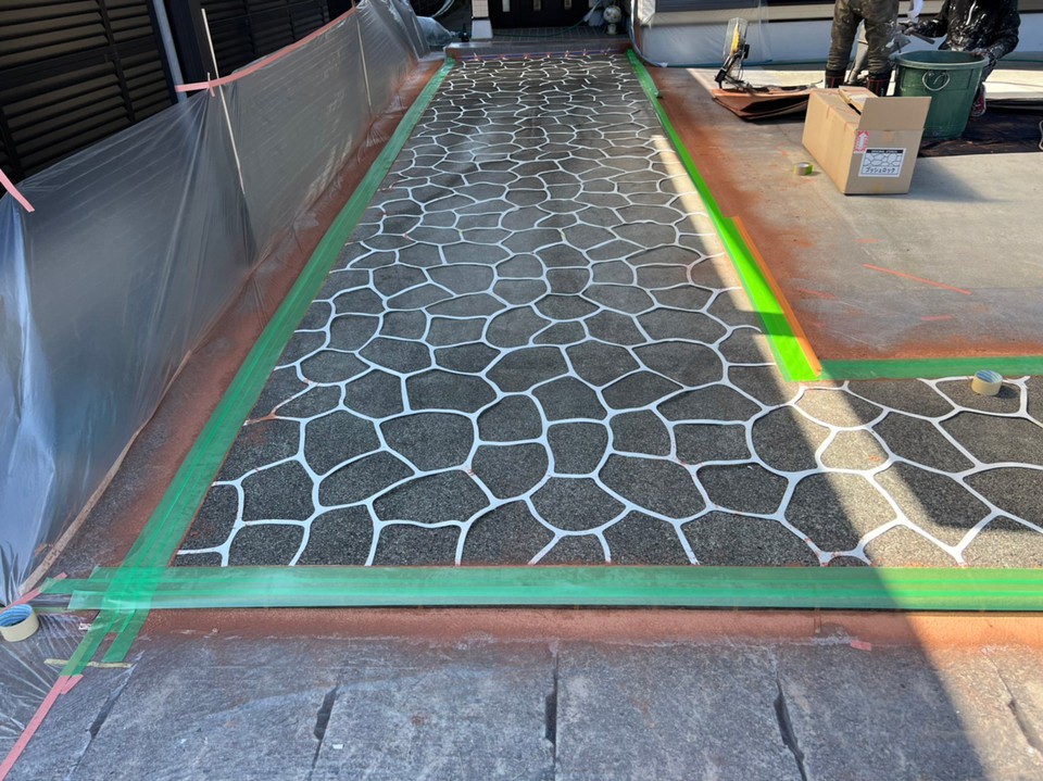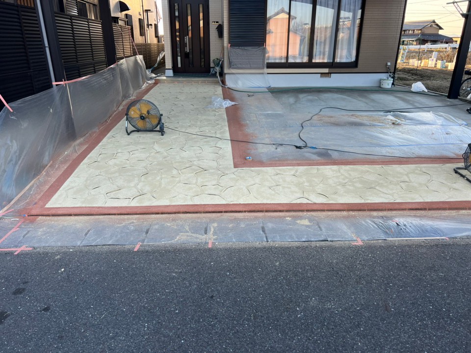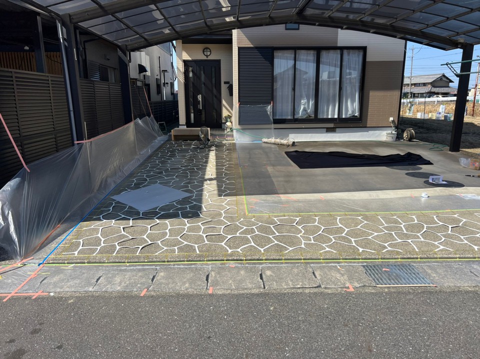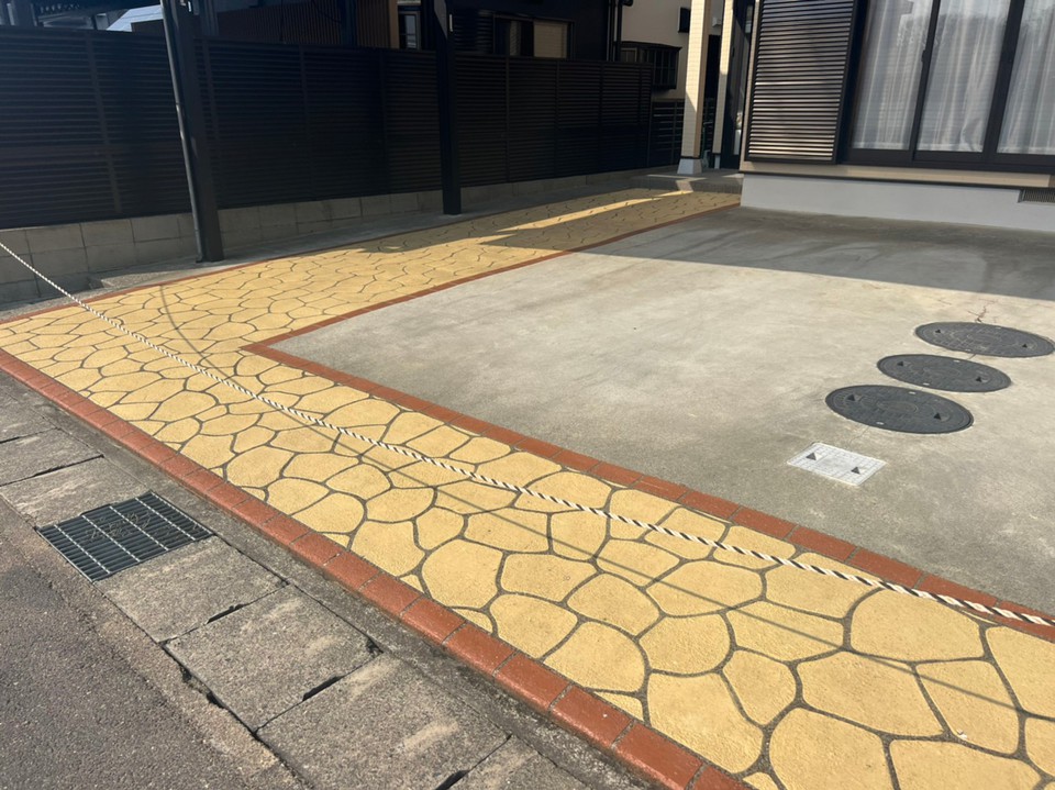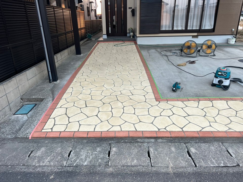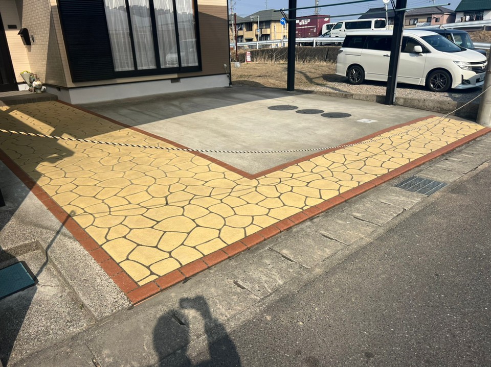 羽島市M様にて駐車場、アプローチのマットスプレーを行いました。 既設の土間コンクリートに塗装をするだけで 簡単にイメージチェンジが可能です。 コンクリートを壊すことなくできる景観舗装。 すべり止め効果もあり、表面強度はコンクリートの数倍。 車が乗っても割れません。 ステンシル:ブッシュロック/レンガ模様 色:イエローストーン