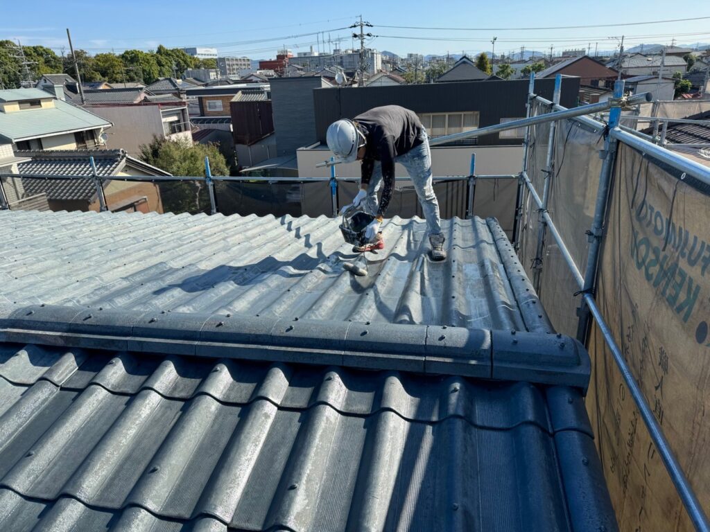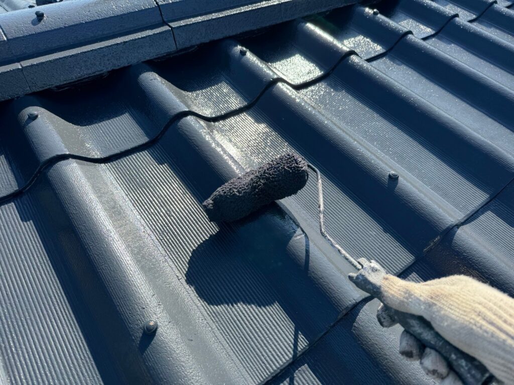 屋根下塗り作業 セキスイ瓦Uはスレート瓦です